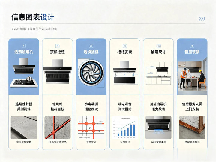 装修时先定好油烟机款式、尺寸,再做橱柜定制,别先做橱柜再选烟机,很容易出现尺寸不符,要么勉强安装影响使用,要么砸改橱柜多花钱。